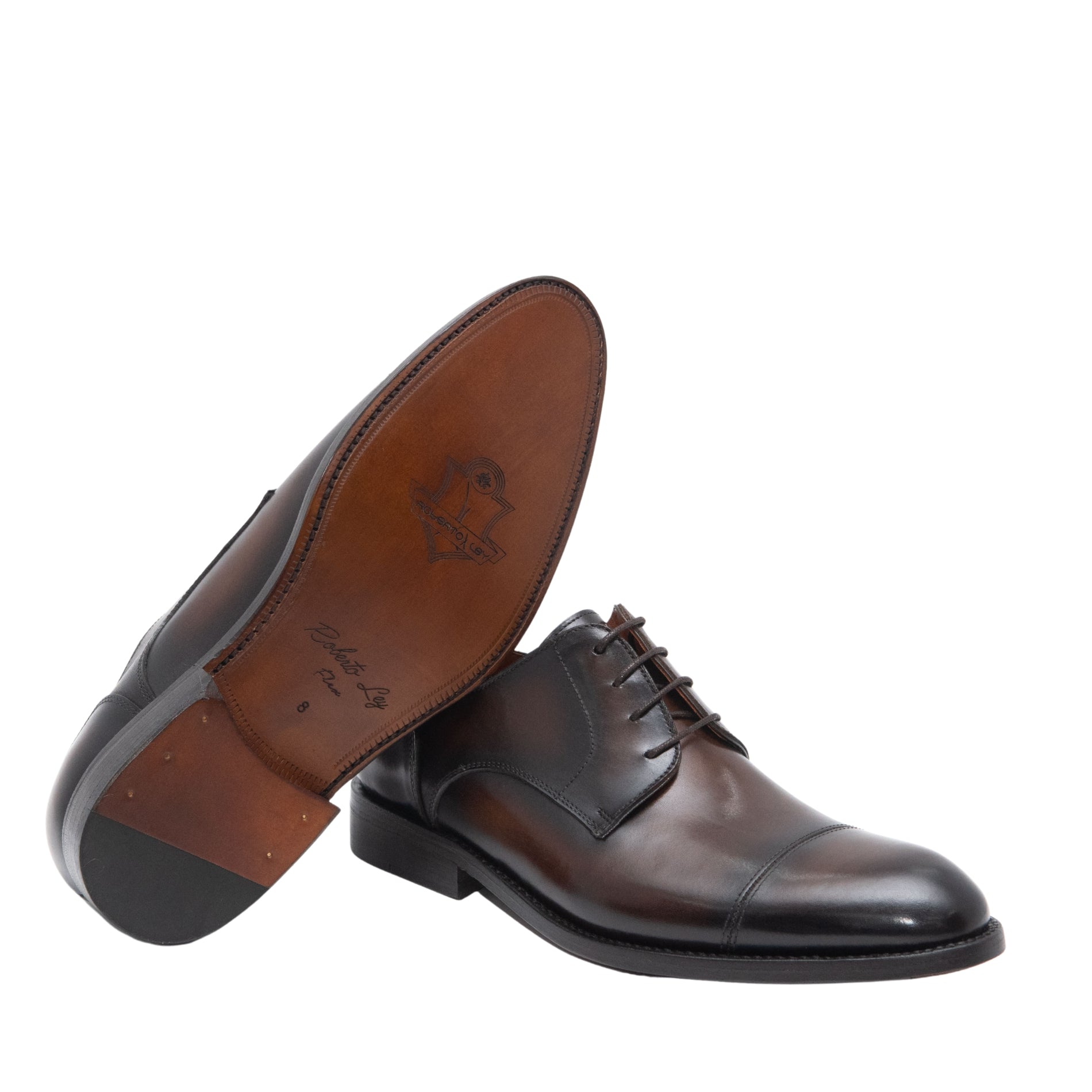 Zapato de cordones en piel natural, patinado a mano para dar colores artesanales y únicos al producto. Completamente manual. Cerco de suela. Forro de piel vacuno y Suela de cuero. Roberto Ley. Fabricación Goodyear